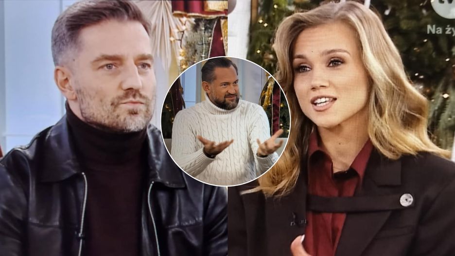 Speszony Marcin Rogacewicz aż nie wiedział, co powiedzieć. Musiała mu pomóc ukochana.